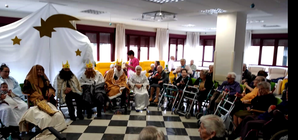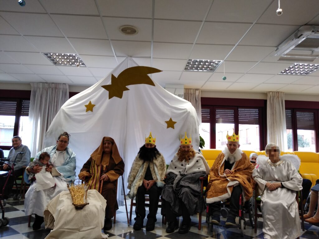 La recreación del Nacimiento ha contado con la ayuda de algunos de nuestros residentes para hacer de San José, los Reyes Magos y el angelito, así como la visita de nuestra compañera Nuria y su hija Sara.