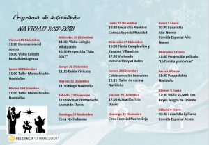 La residencia Fundación la Inmaculada de Villalpando, se suma como cada año a las celebraciones navideñas con un programa de actividades que arrancó el pasado 15 de Diciembre con la visita de los niños del colegio La Milagrosa de Zamora y que continuará con talleres de manualidades, la visita del colegio de Villalpando, un bingo navideño, numerosas actuaciones musicales, un taller de cocina, el Belén viviente… Y para terminar las fiestas, sus majestades los Reyes Magos de Oriente visitarán nuestra residencia cargados de sorpresas y regalos.